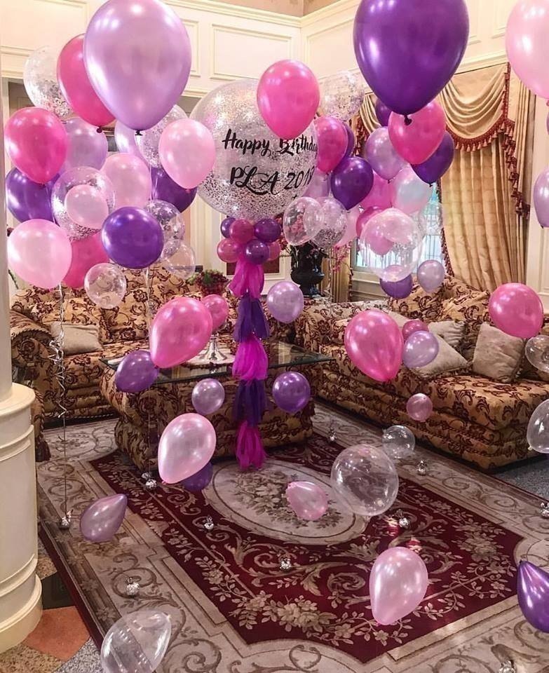 - 4 фонтанов из 7 шаров (розовых металлик, фуксия металлик,лавандовых металлик,фиолетовых металлик, прозрачных с конфетти серебро) Премиум (35 см) (з)