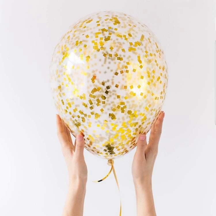 - 1 латексный шар прозрачный с золотым квадратным конфетти на ленте.